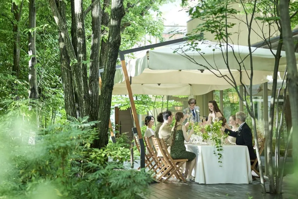 | 模擬挙式 | 360度を緑に囲まれた全面ガラス張りのチャペルで、まばゆい光が射し込む中、自然体であたたかな誓いを。ゲストに祝福される人前式も人気。ハープやオルガンの美しい音色が誓いの瞬間を演出する。※最大収容120名 |